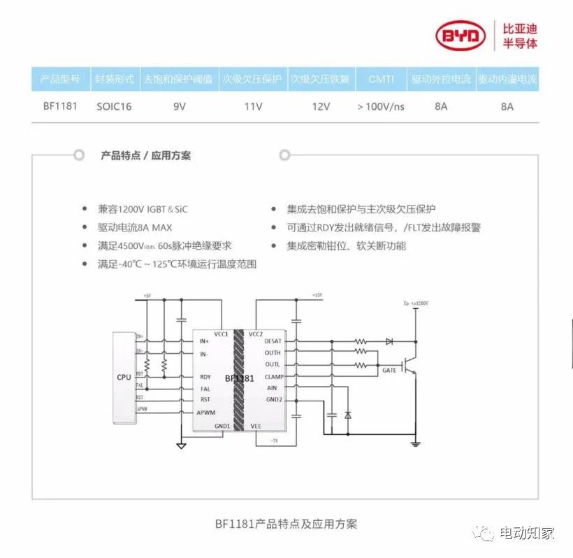 來自電動知家消息,12月14日,比亞迪半導體在先前研發成果的基礎上,成功自主研制并量產1200V功率器件驅動芯片BF1181,今年12月大規模生產并向各大廠商供貨。